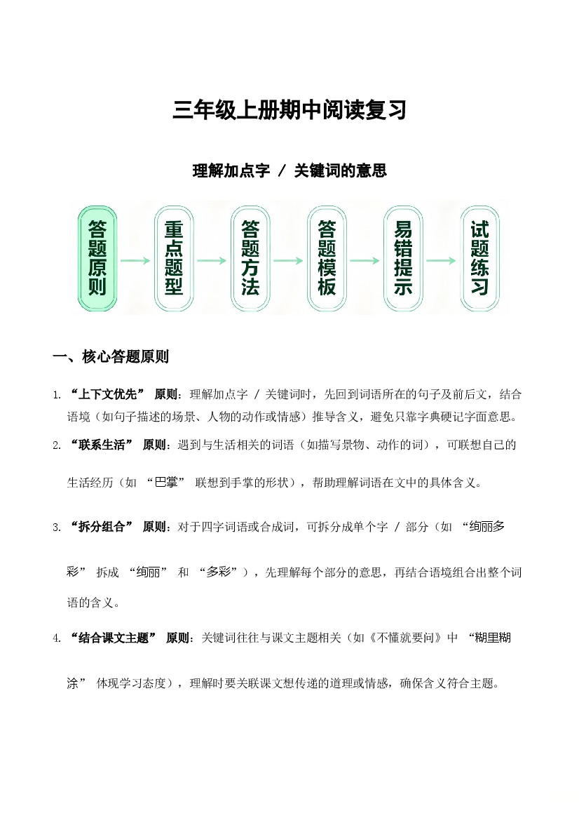 阅读专题01:理解加点字、关键词的意思(期中专项训练)三年级语文上学期(统编版·新教材)