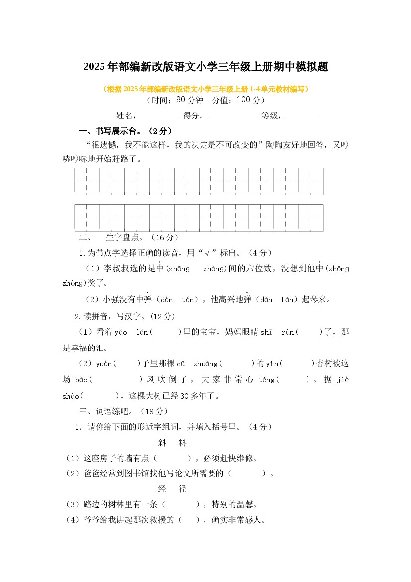 25年三上语文期中模拟题(有答案)