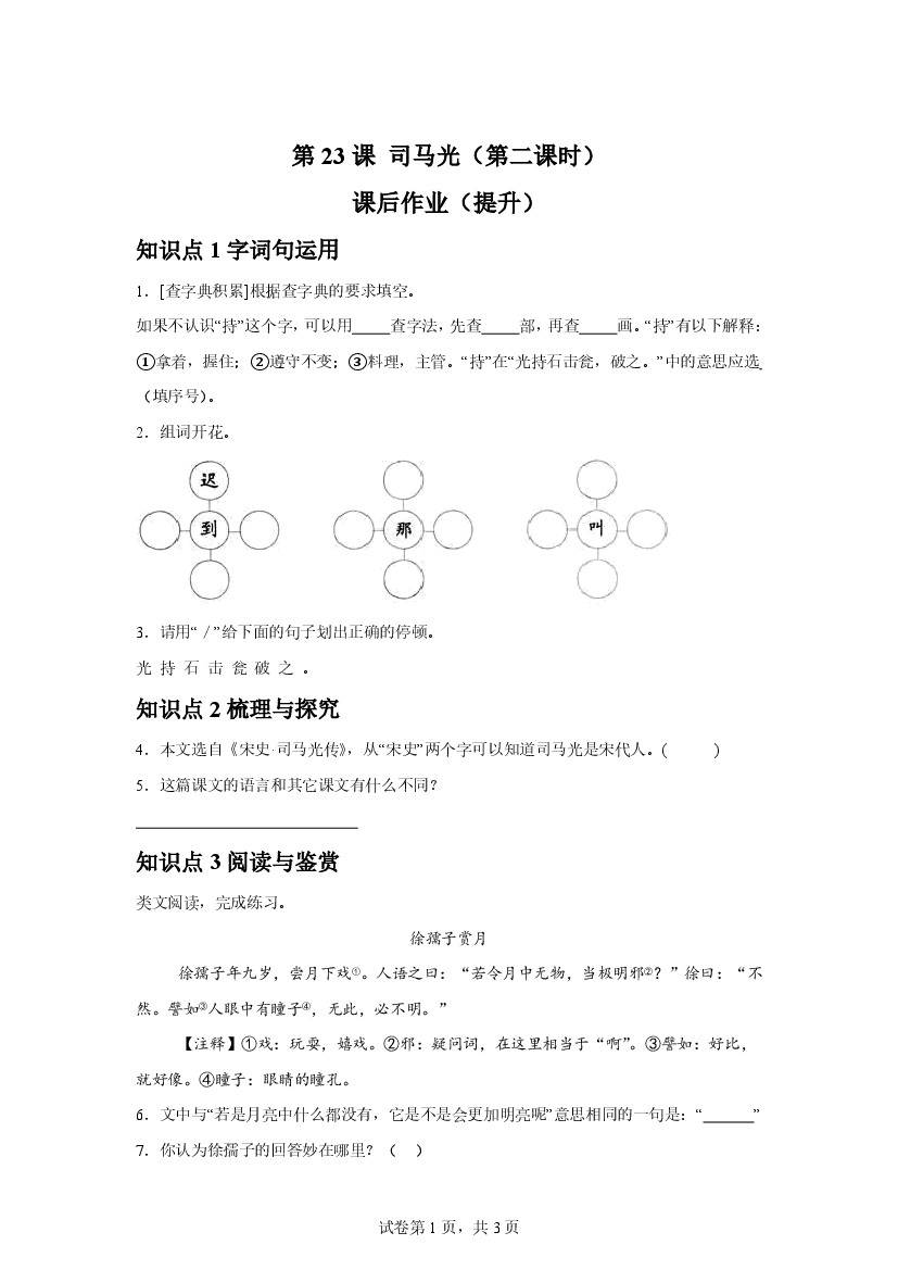 25年秋【三上语文】第23课 司马光(第二课时)课后作业(提升)