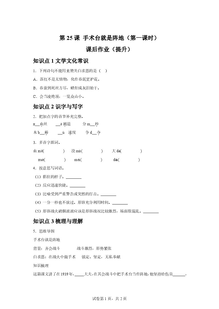 25年秋【三上语文】第25课 手术台就是阵地(第一课时)课后作业(提升)
