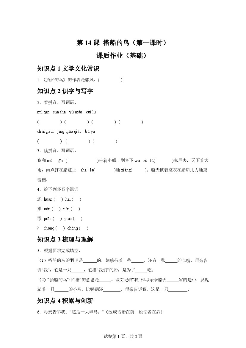 25年秋【三上语文】第14课 搭船的鸟(第一课时)课后作业(提升)