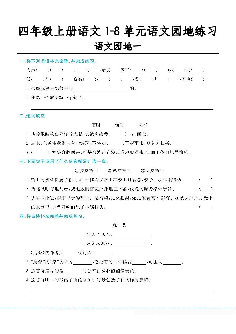 四年级上册语文课内背诵默写单暑假预习(12页)