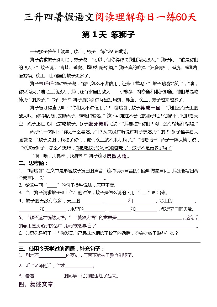 三升四暑假语文阅读理解每日一练60天(含答案96页)