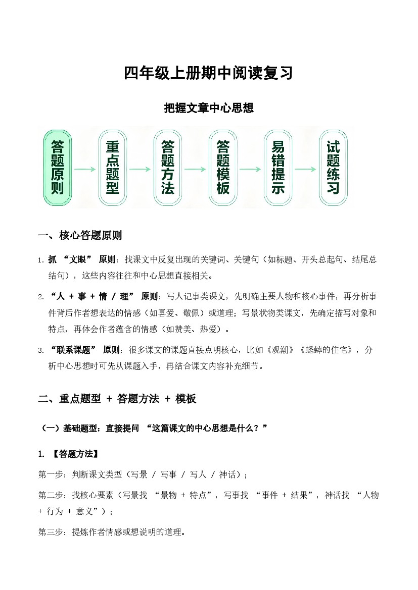 四年级(上)语文 期中阅读复习(把握文章中心思想)