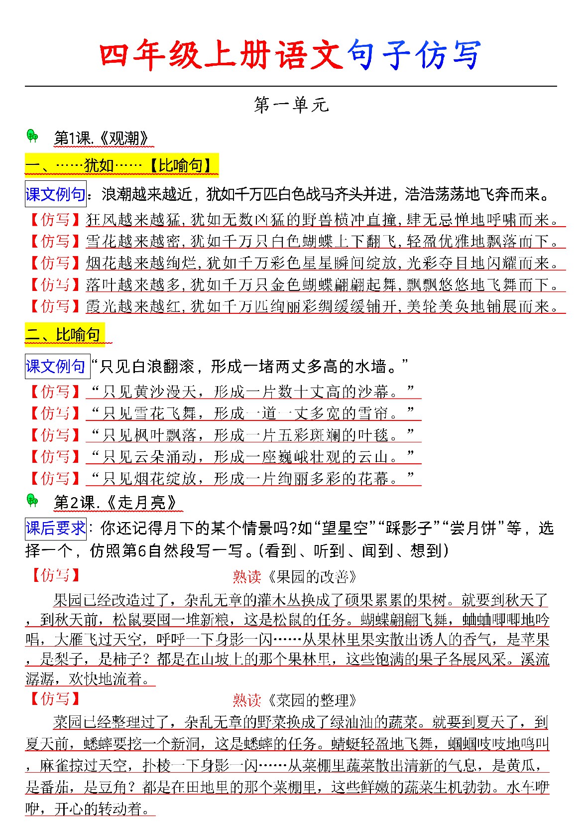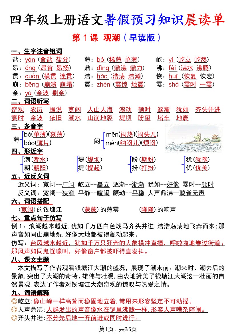 四上语文暑假每日一课基础知识预习单(含答案64页)