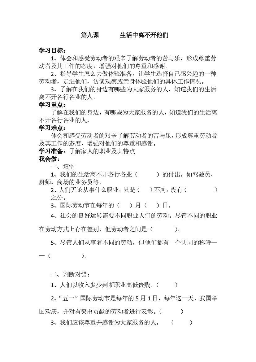 人教部编版四年级下册《道德与法治》第9课生活中离不开他们课课练