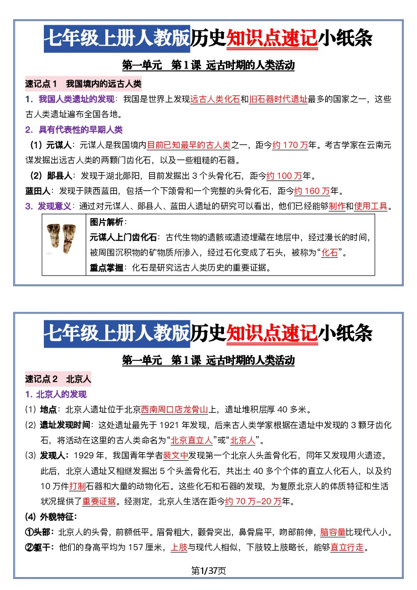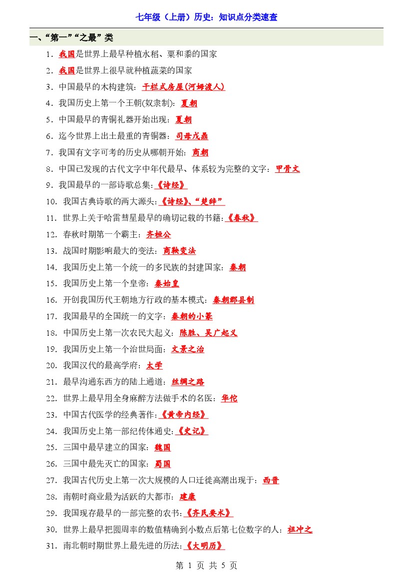 七年级上册历史知识点分类速查(5页)
