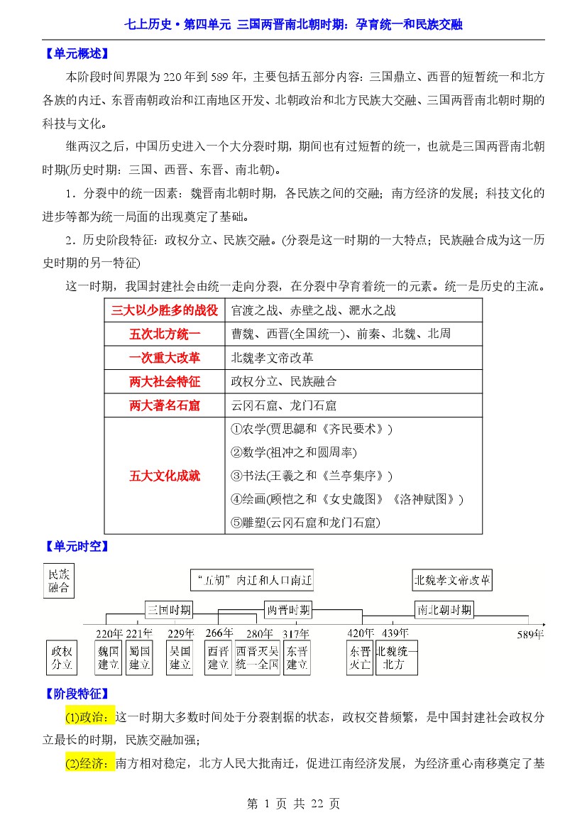 第四单元 三国两晋南北朝时期:孕育统一和民族交融【速记清单】七级历史上册单元速记·巧练(统编版)