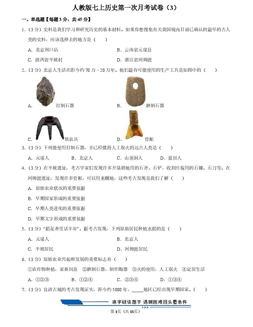 人教版七上历史第一次月考试卷(3)