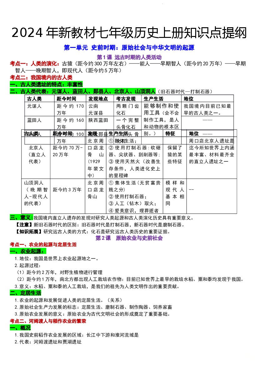2024版七年级上册历史全册知识提纲.