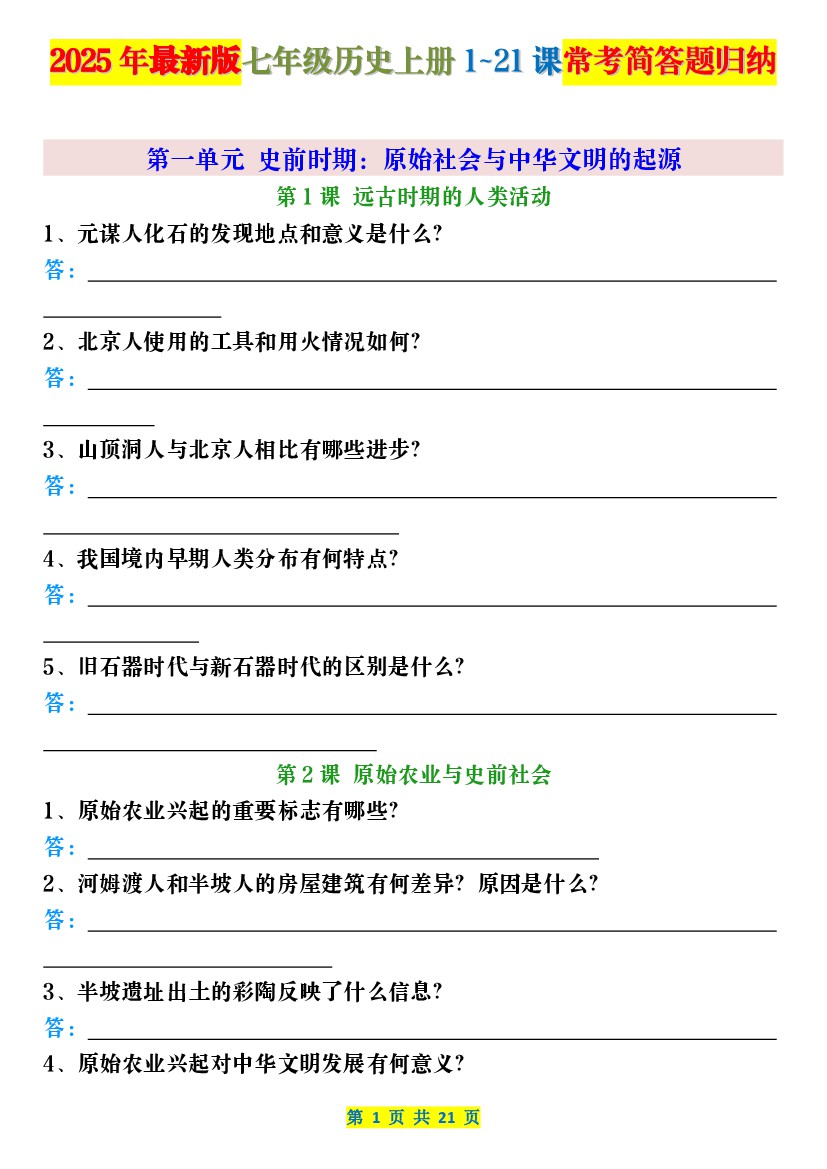 2025年最新版七年级历史上册1~21课常考简答题归纳