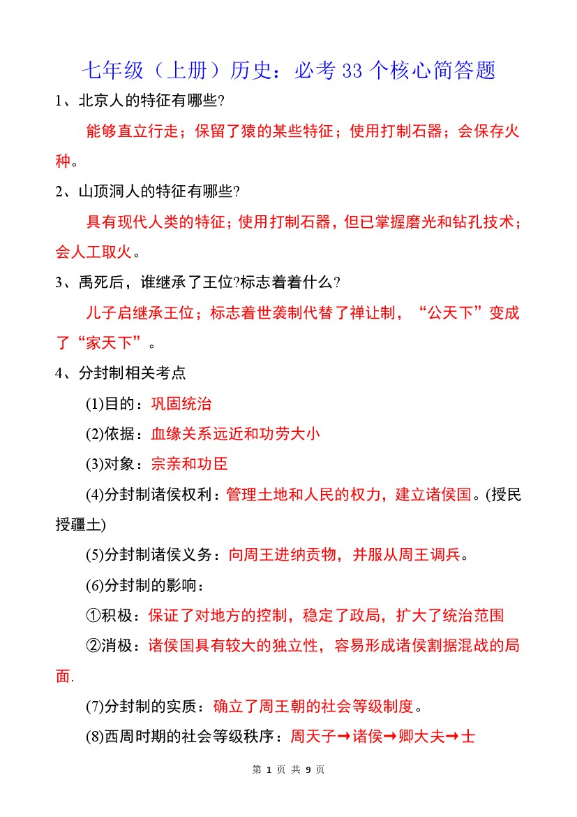 七年级(上册)历史:必考33个核心简答题