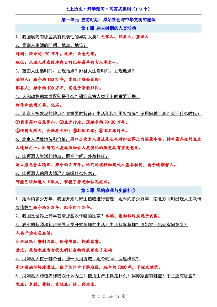 七年级上册历史预习必背问答式提纲173个(19页)