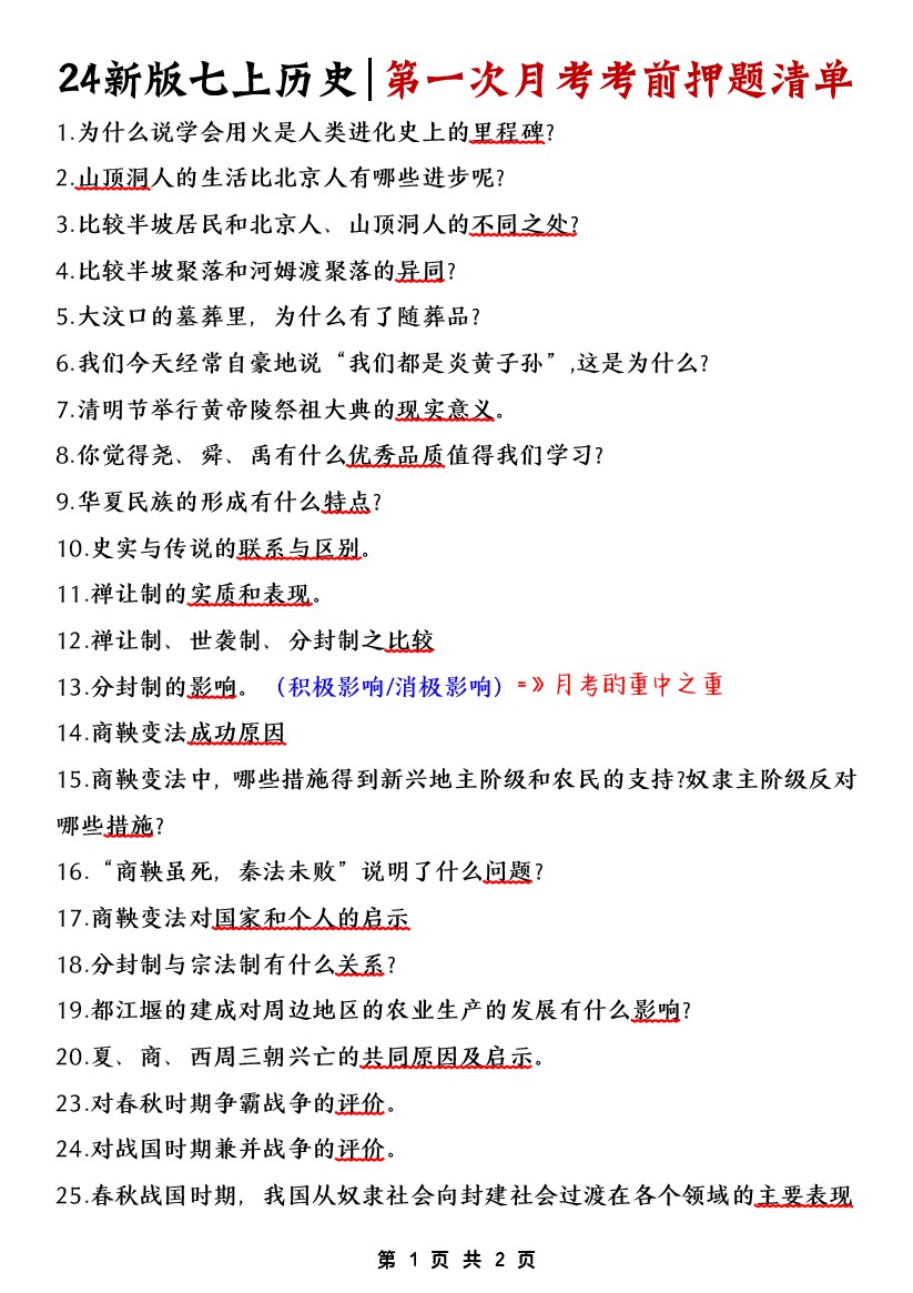 24新版七上历史月考押题清单
