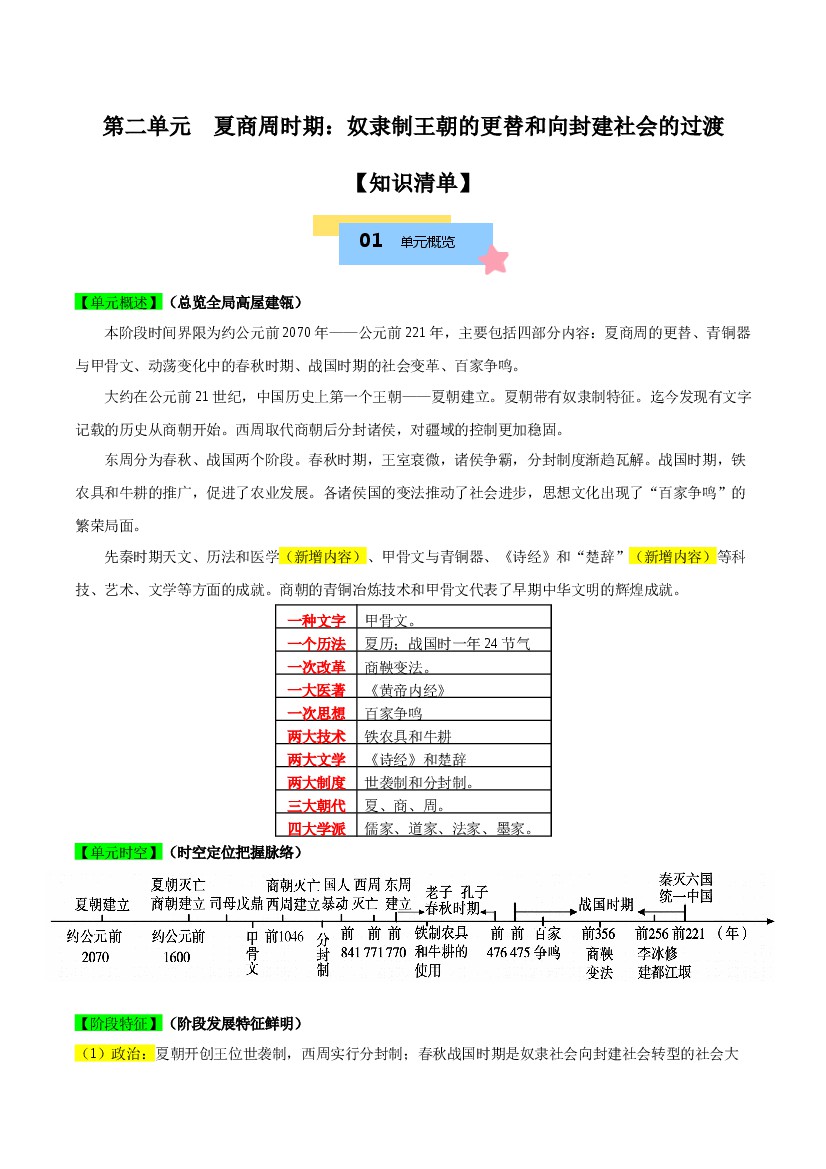 第二单元 夏商周时期:奴隶制王朝的更替和向封建社会的过渡【速记清单】七级历史上册单元速记·巧练(统编版)