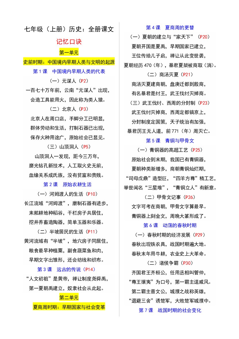 七年级(上册)历史速记顺口溜