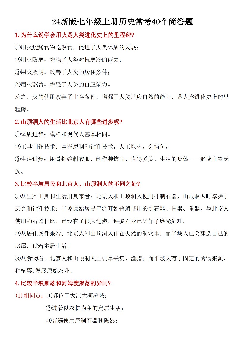 2024新版七年级上册历史常考40个简答题