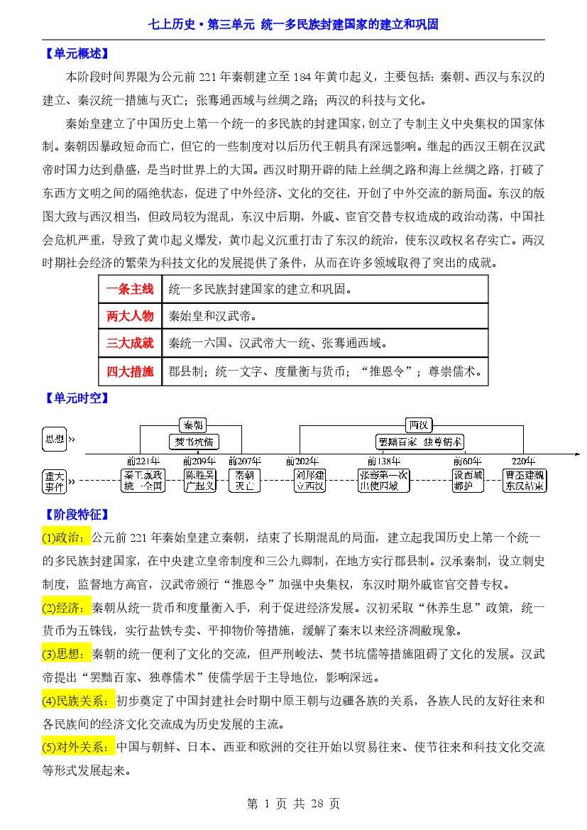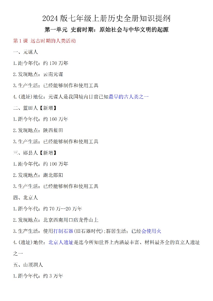 【新教材】2024版七年级上册历史全册知识提纲
