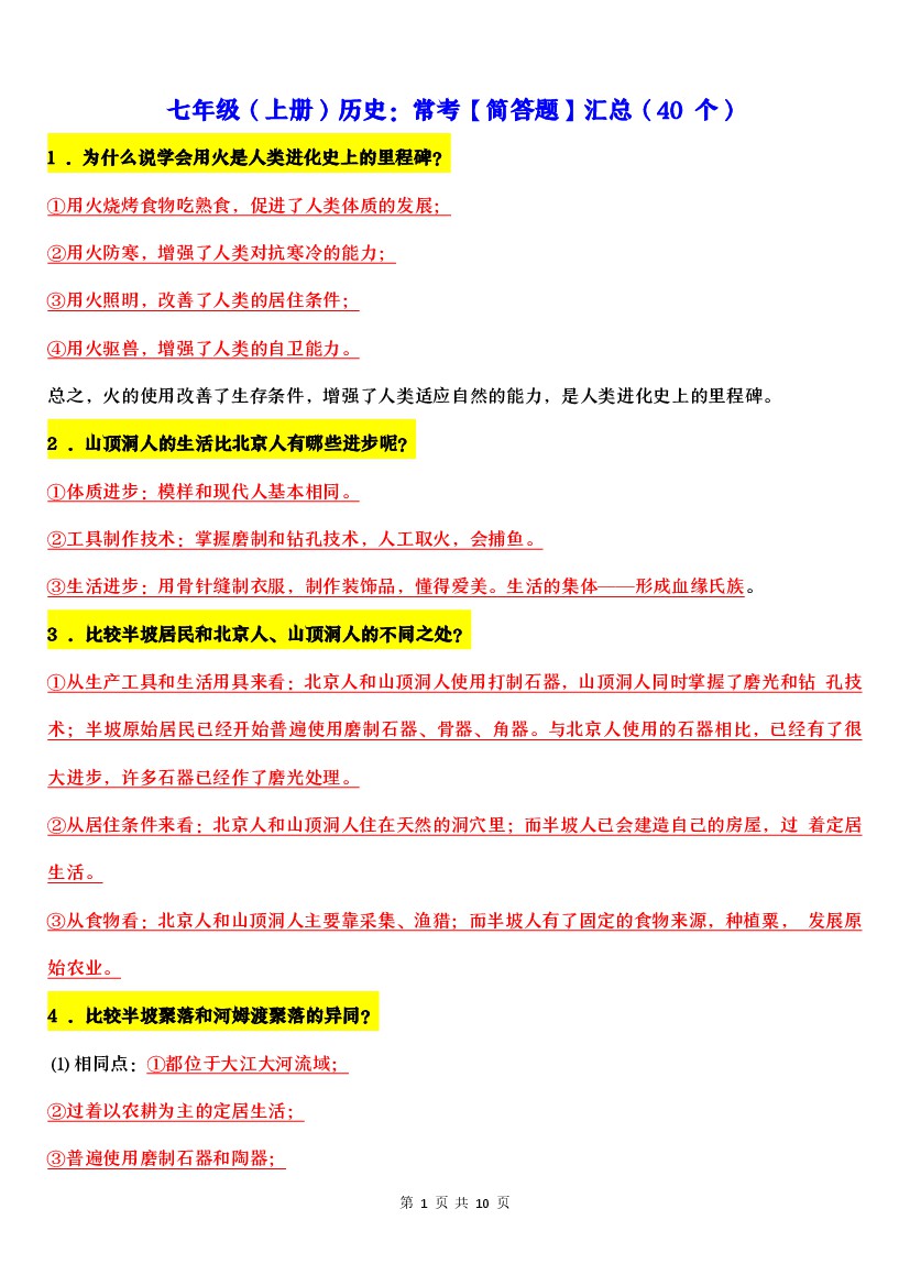 七年级上册历史全册复习93个教材问题解答(18页)