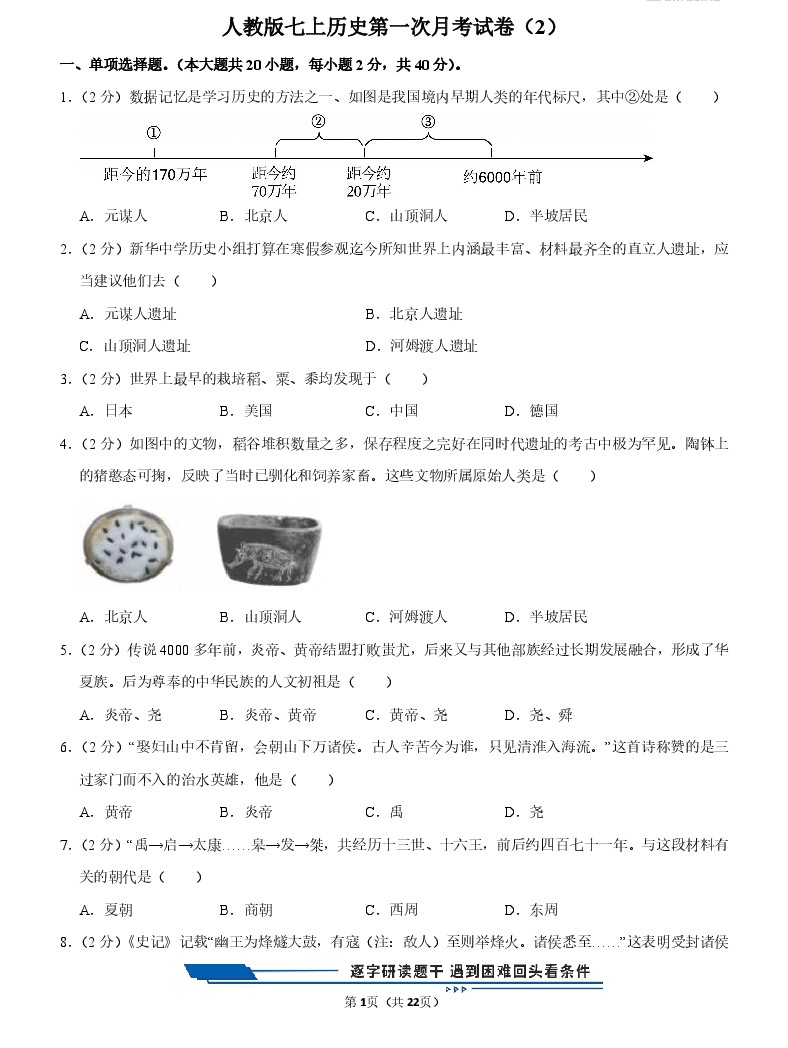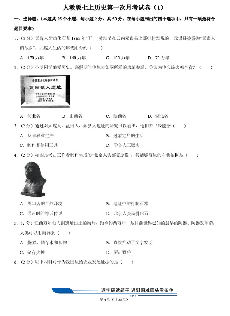 人教版七上历史第一次月考试卷(2)