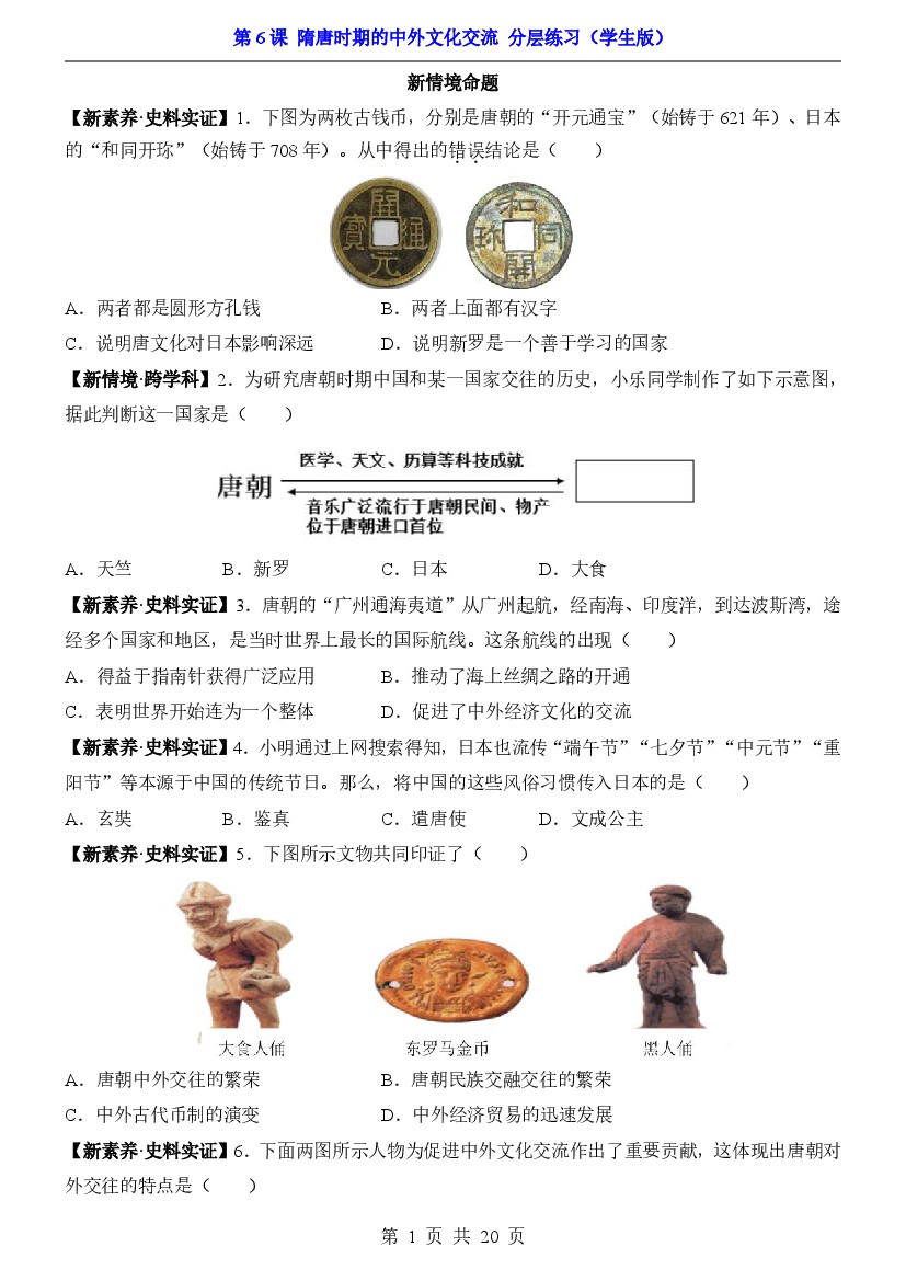 2025年七下历史一课一练第6课隋唐时期的中外文化交流(分层练习)