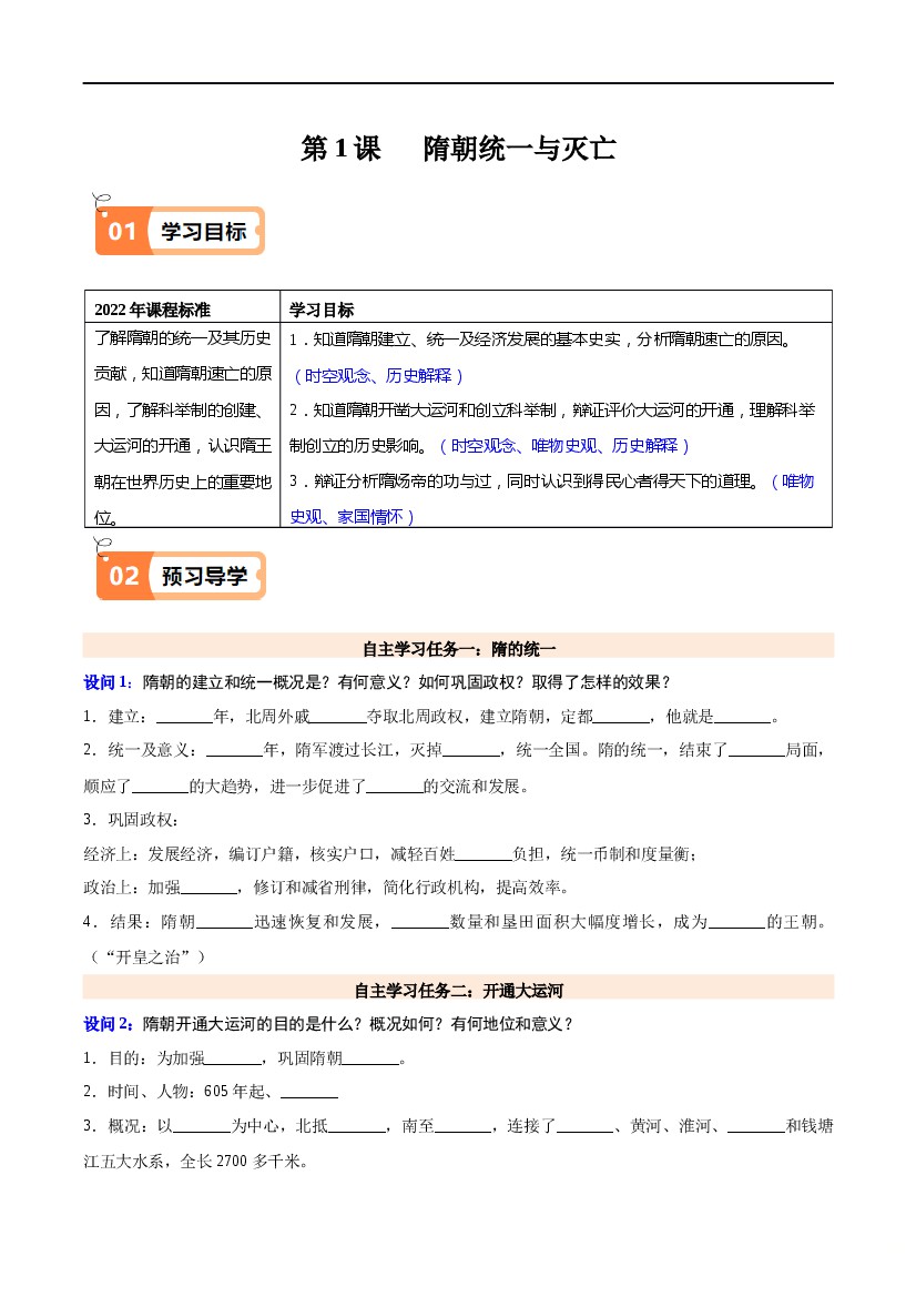 2025年七下历史一课一练第1课隋朝统一与灭亡(原卷版)-七年级历史下册同步学与练(统编版)