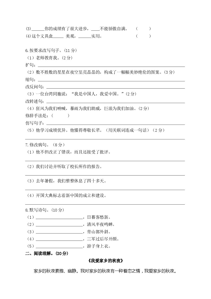 小学 25年秋六上语文期中精选卷(3)(附参考答案)