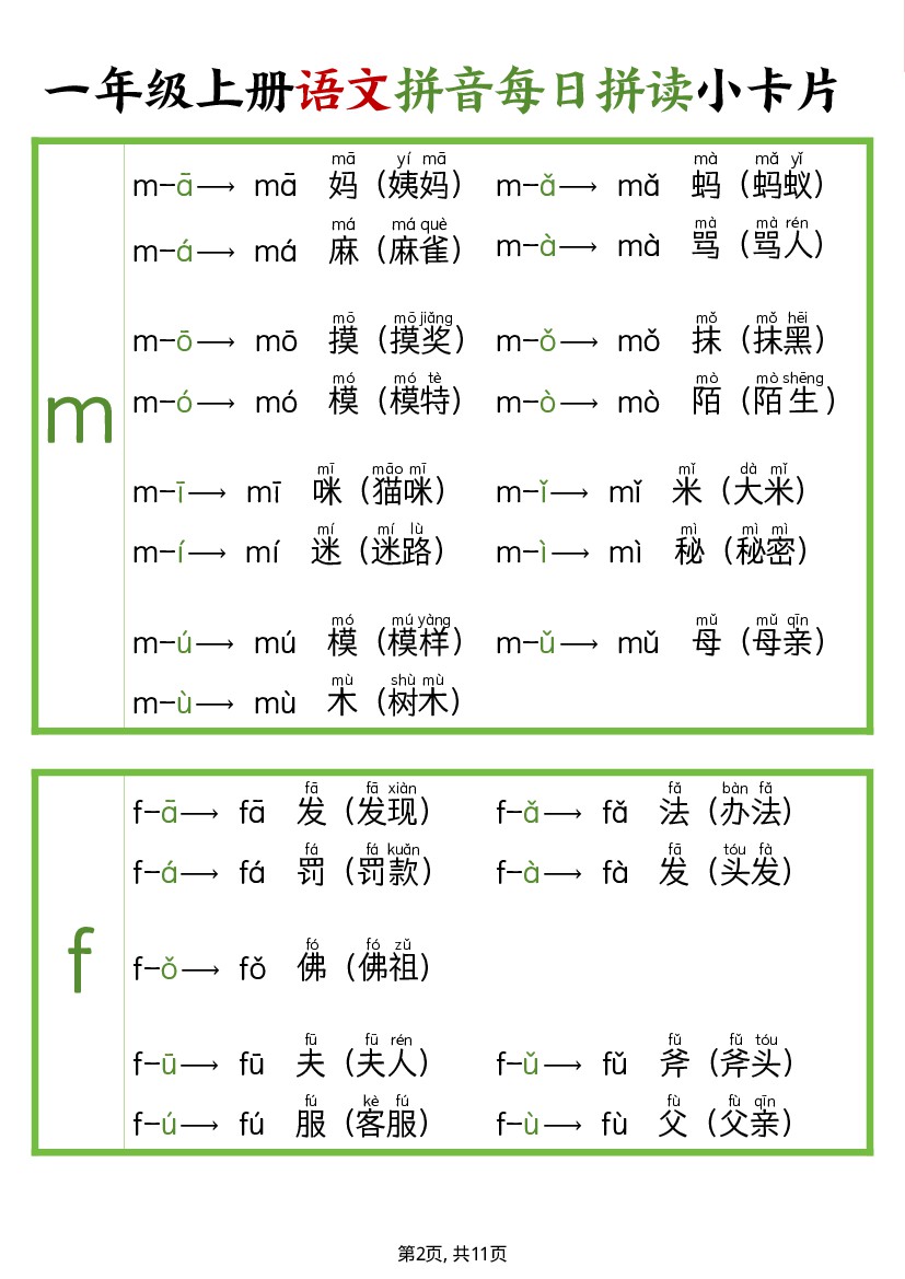 新版一上语文拼音每日拼读小卡片(完整11页)