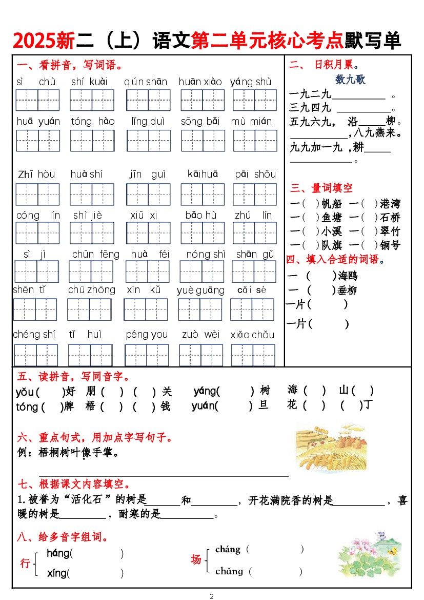 小学 25新二年级上册语文《1-8单元核心考点默写单》(含答案16页)