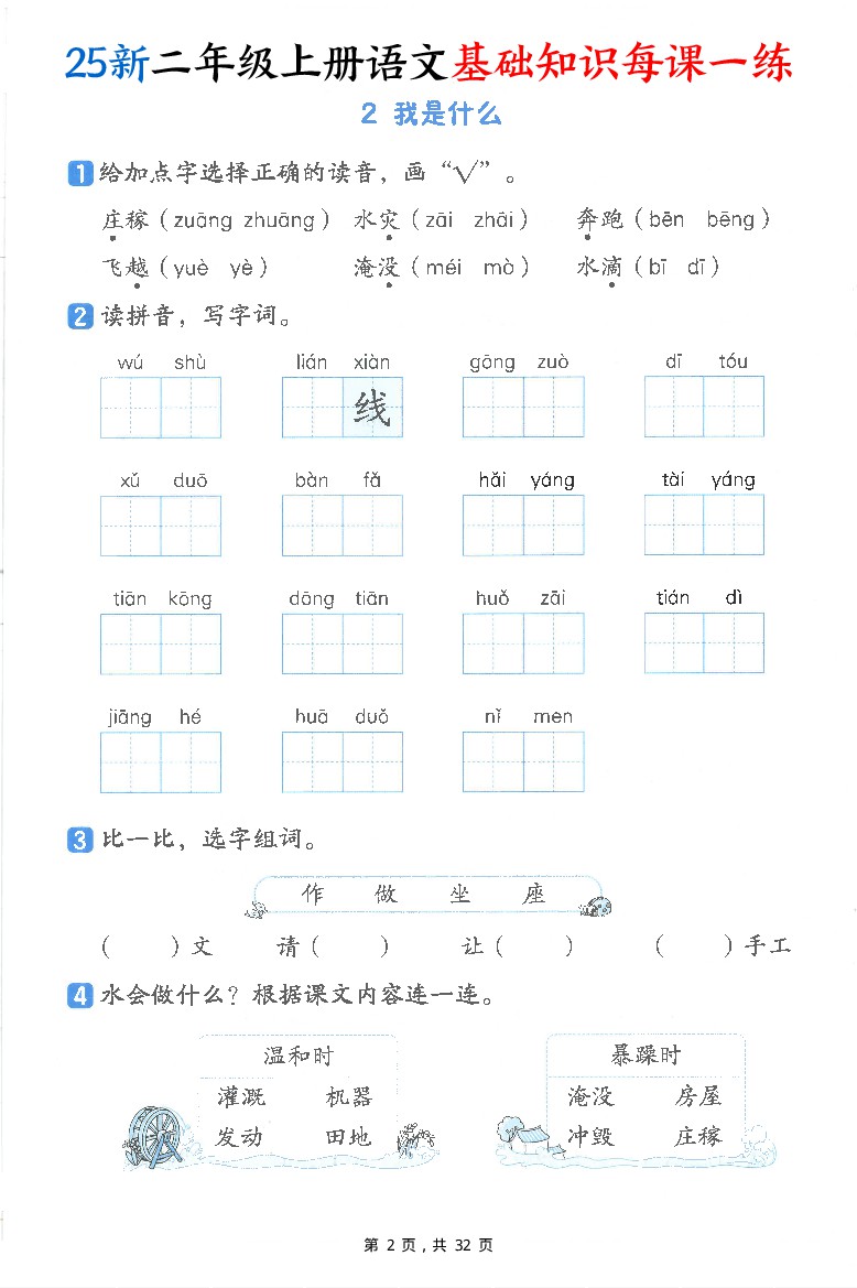 小学 25新二上语文基础知识每课一练(含答案32页)