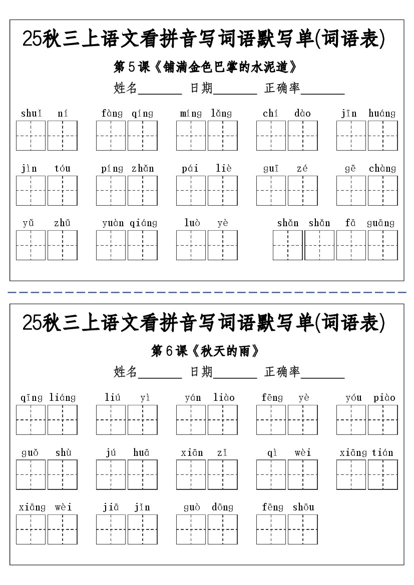 小学 三上25秋语文看拼音写词语默写单(词语表)-含答案12页