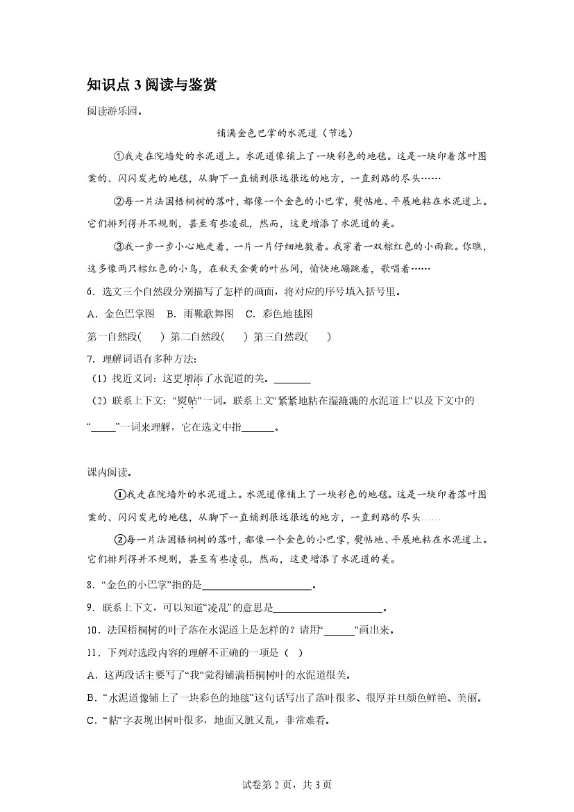 25年秋【三上语文】第5课 铺满金色巴掌的水泥道(第二课时)课后作业(基础)
