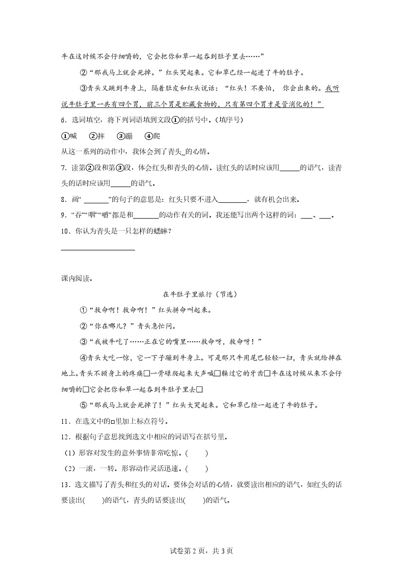 小学 25年秋【三上语文】第12课 在牛肚子里旅行(第二课时)课后作业(基础)