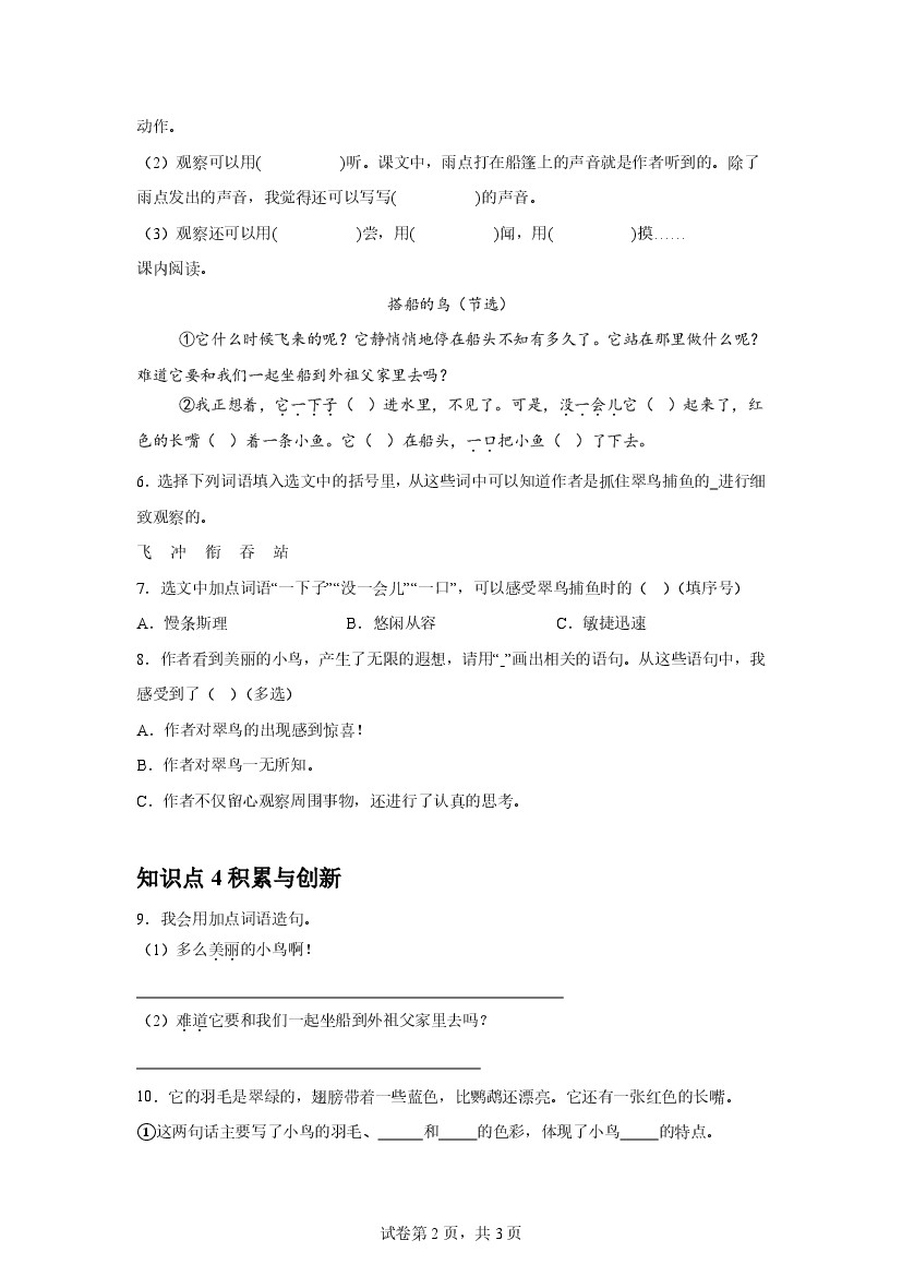 25年秋【三上语文】第14课 搭船的鸟(第一课时)课后作业(提升)