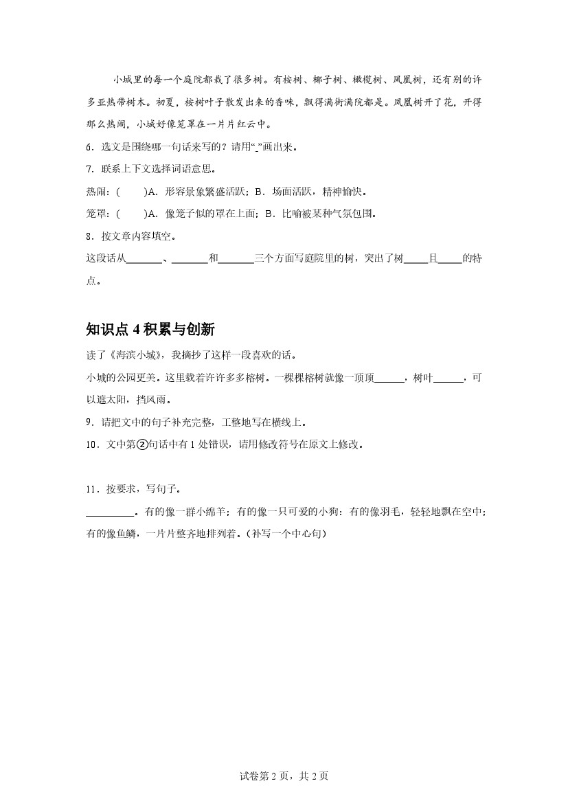 小学 25年秋【三上语文】第17课 海滨小城(第一课时)课后作业(提升)