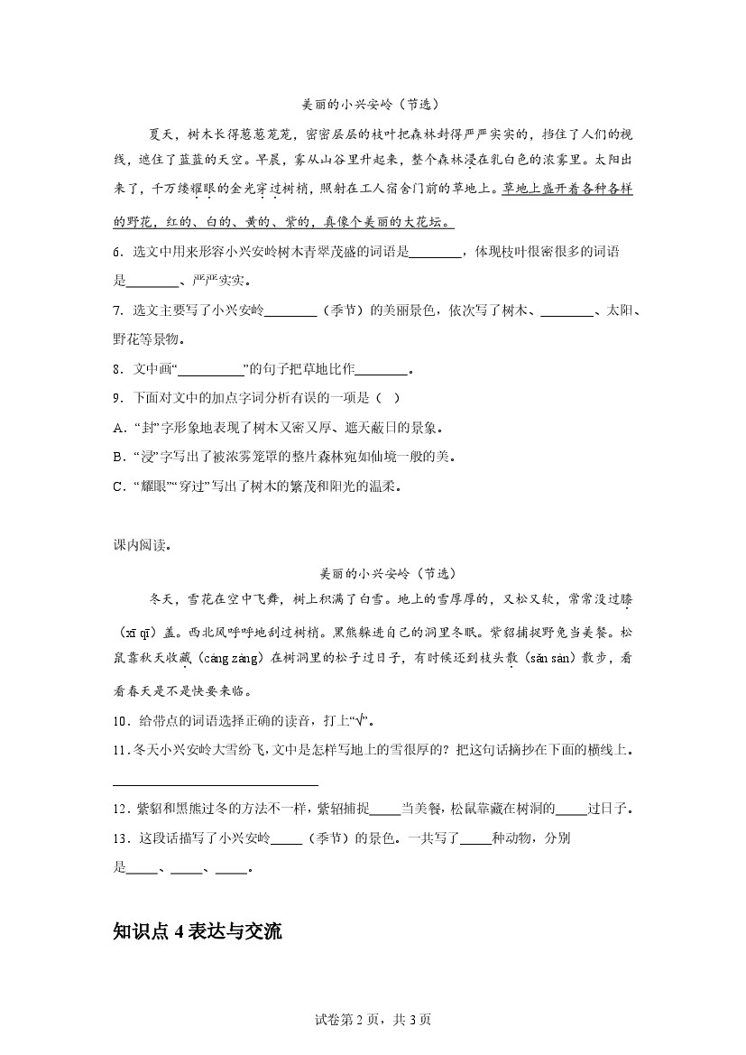25年秋【三上语文】第18课 美丽的小兴安岭(第二课时)课后作业(基础)