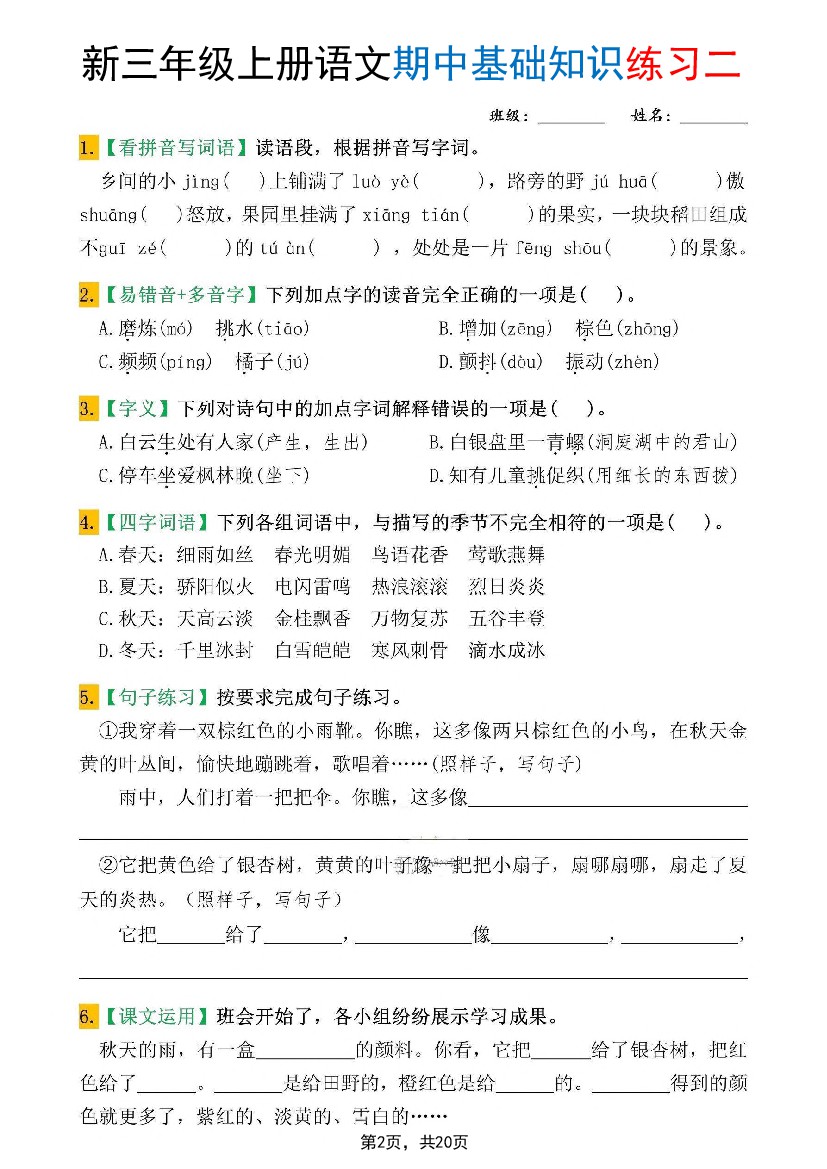 首页 > 全部 > 期中专项 > 新三上语文期中基础知识练习10套(含答案20页)