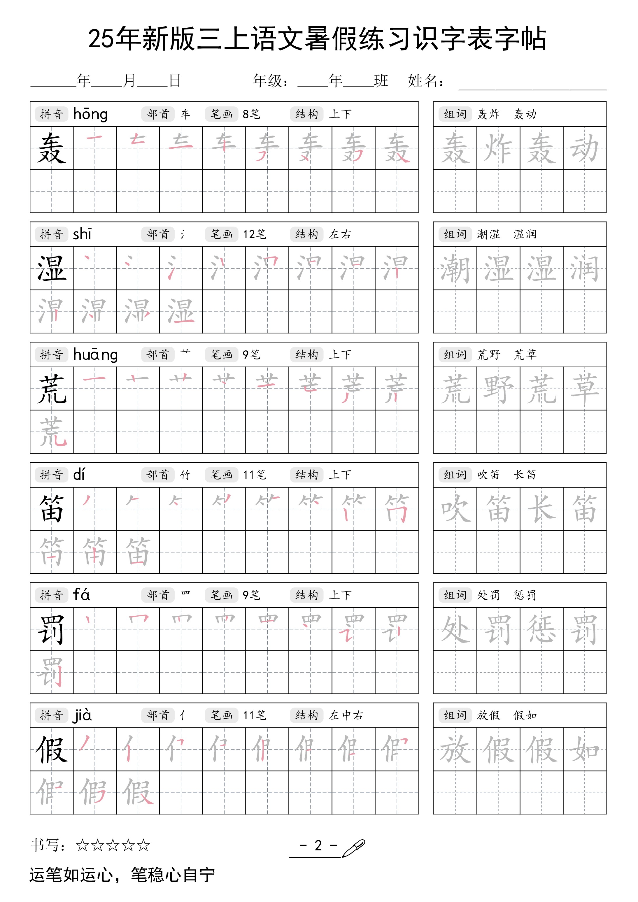 三上语文【25年新版-暑假练习(识字表)字帖】