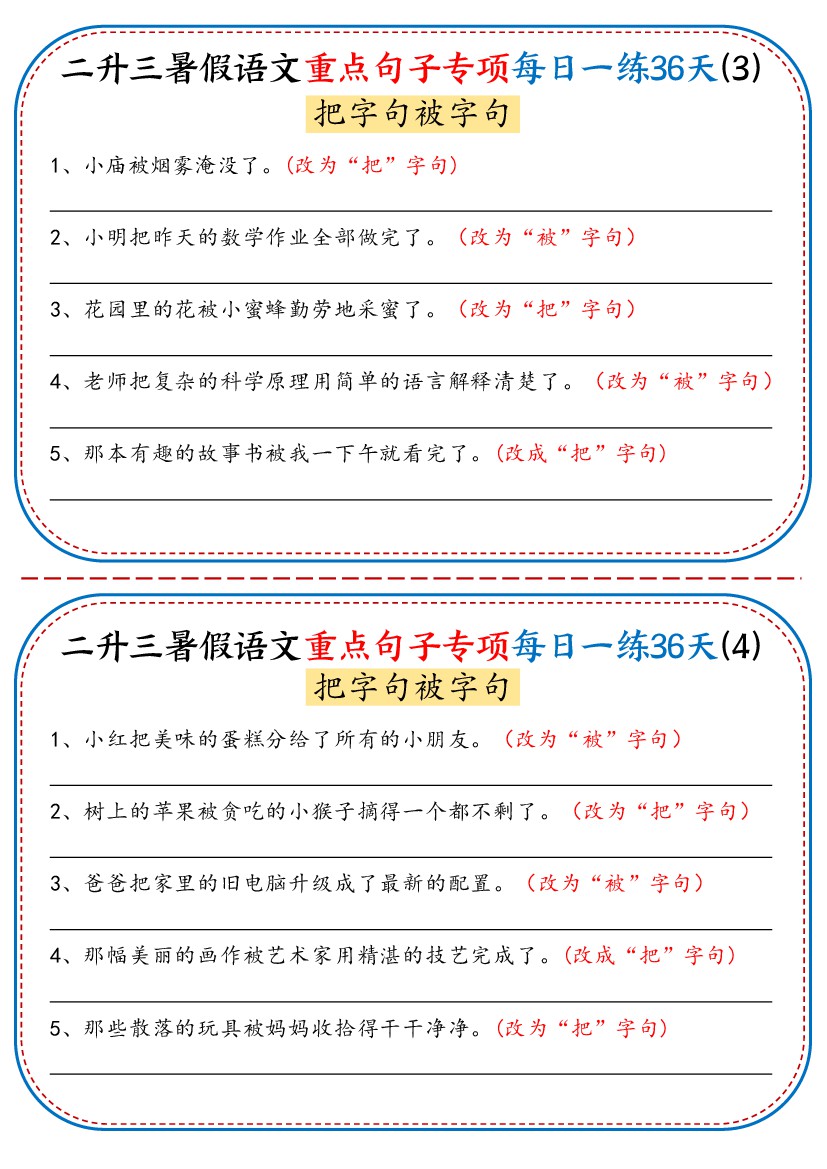 二升三暑假语文重点句子专项每日一练36天(含答案36页)
