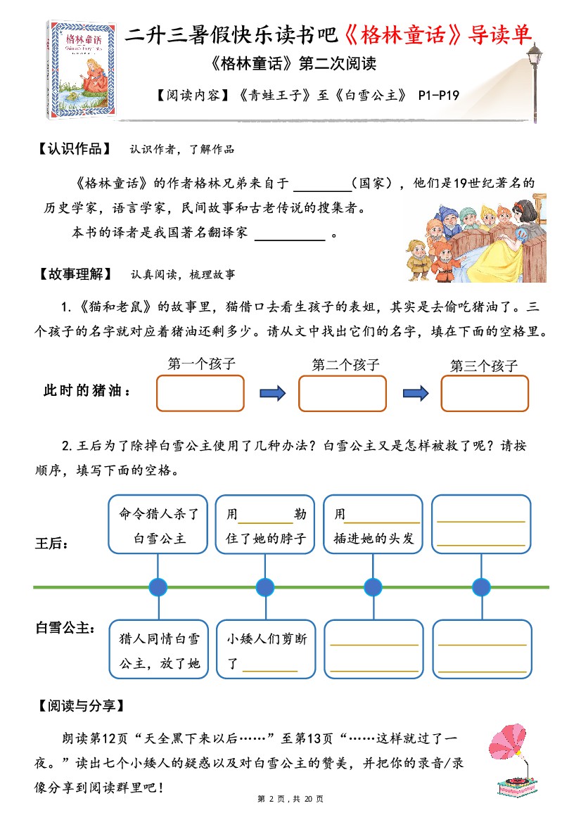小学 二升三暑假快乐读书吧《格林童话》导读单+自测题三套(20页)