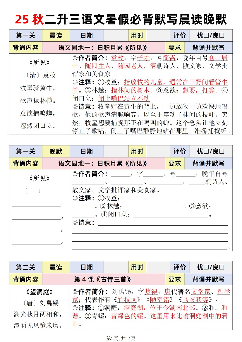小学 25秋新版二升三语文暑假衔接必背闯关表