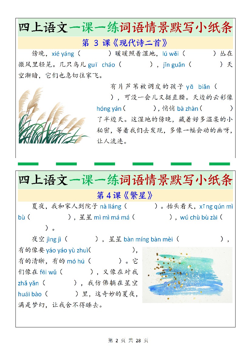 四上语文一课一练词语情景默写小纸条(含答案28页)