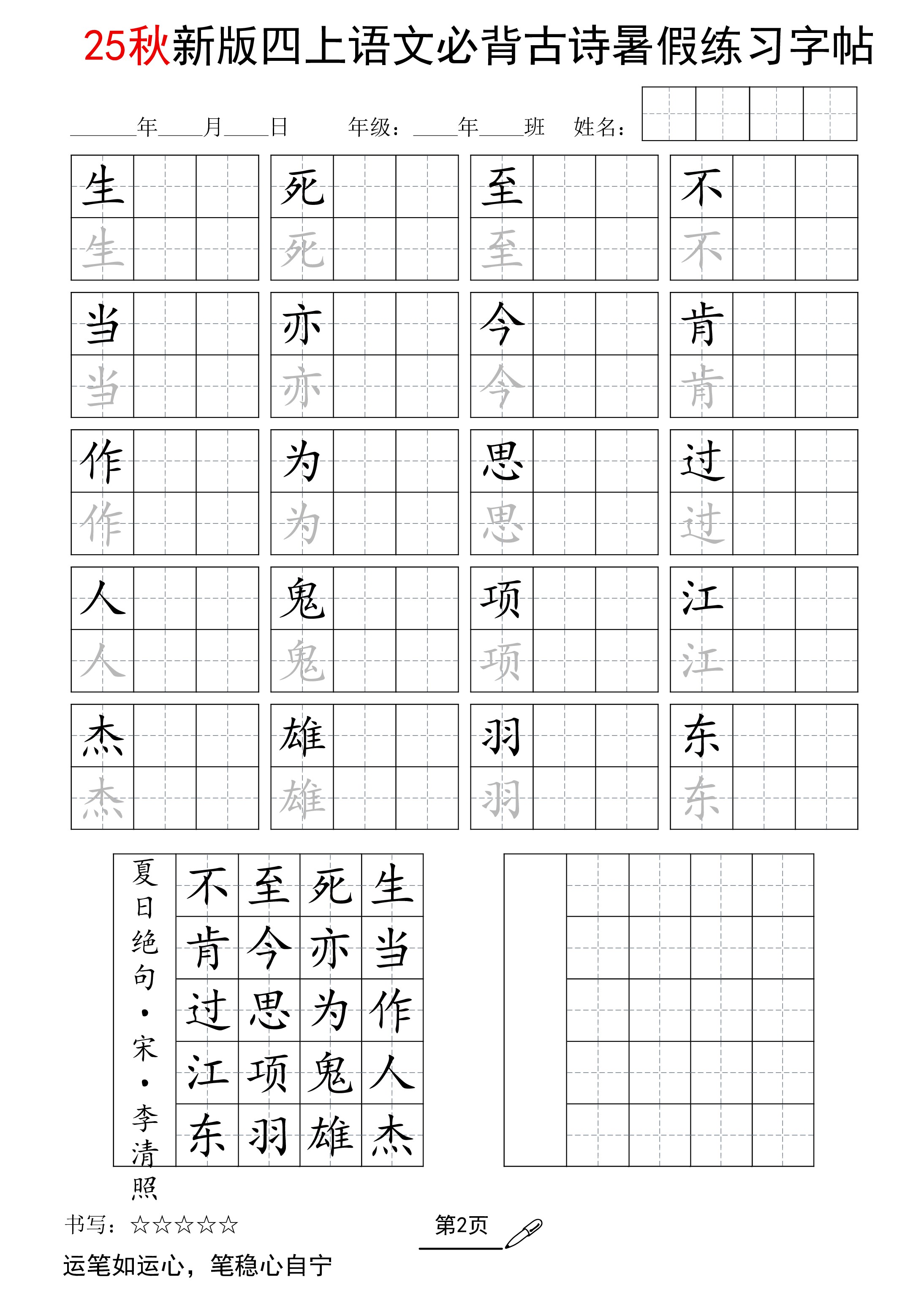25新四(上)语文 暑假五言古诗练习字帖2页