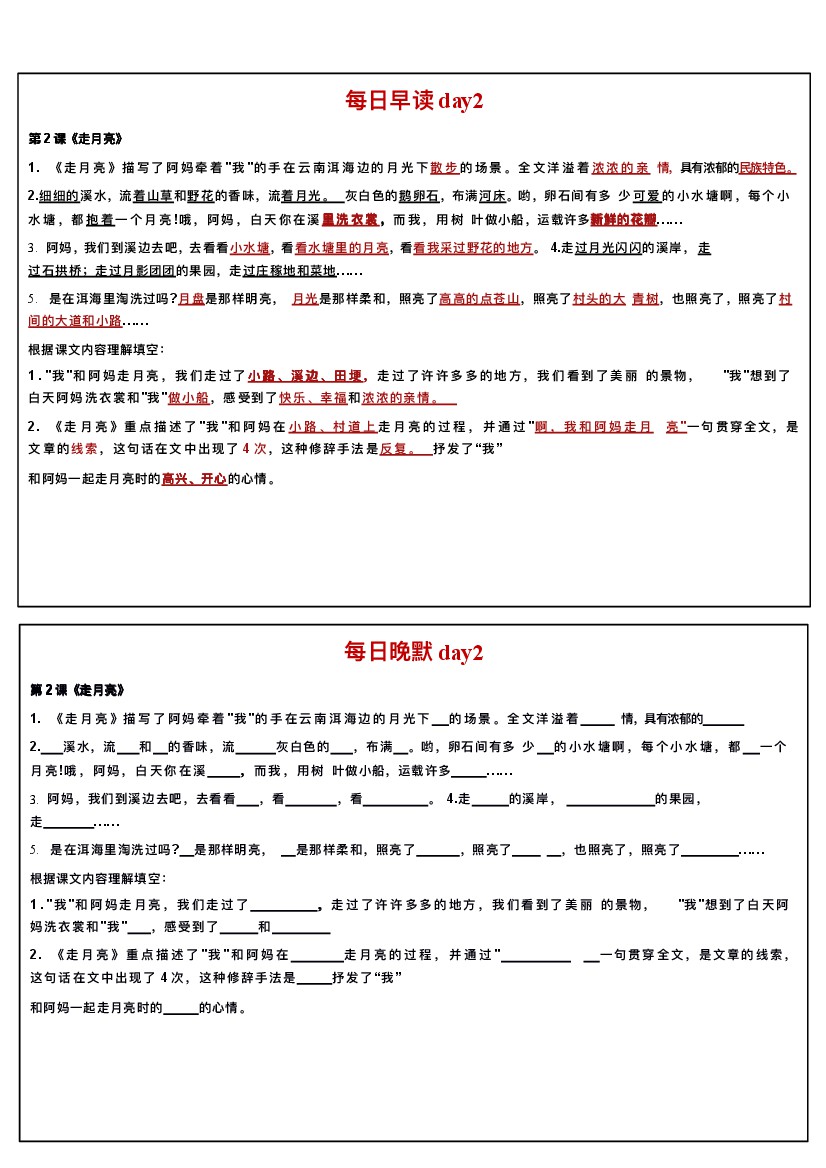 四年级上册语文暑假预习每日早读晚默