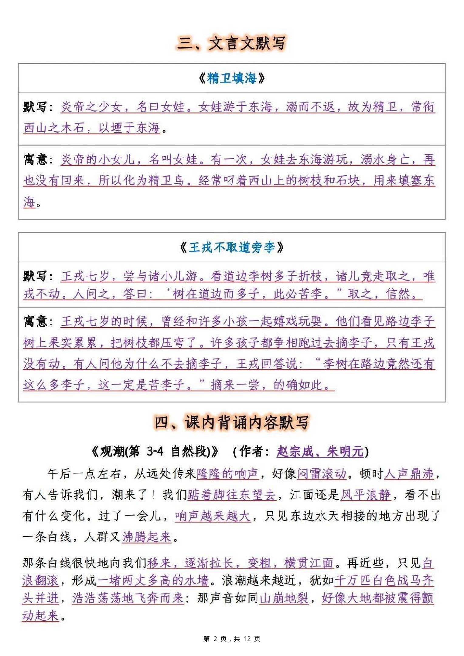 小学 四年级上册语文课内背诵默写单暑假预习(12页)
