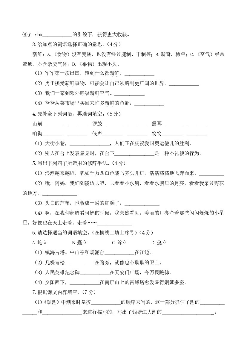 小学 四年级语文第一次月考卷