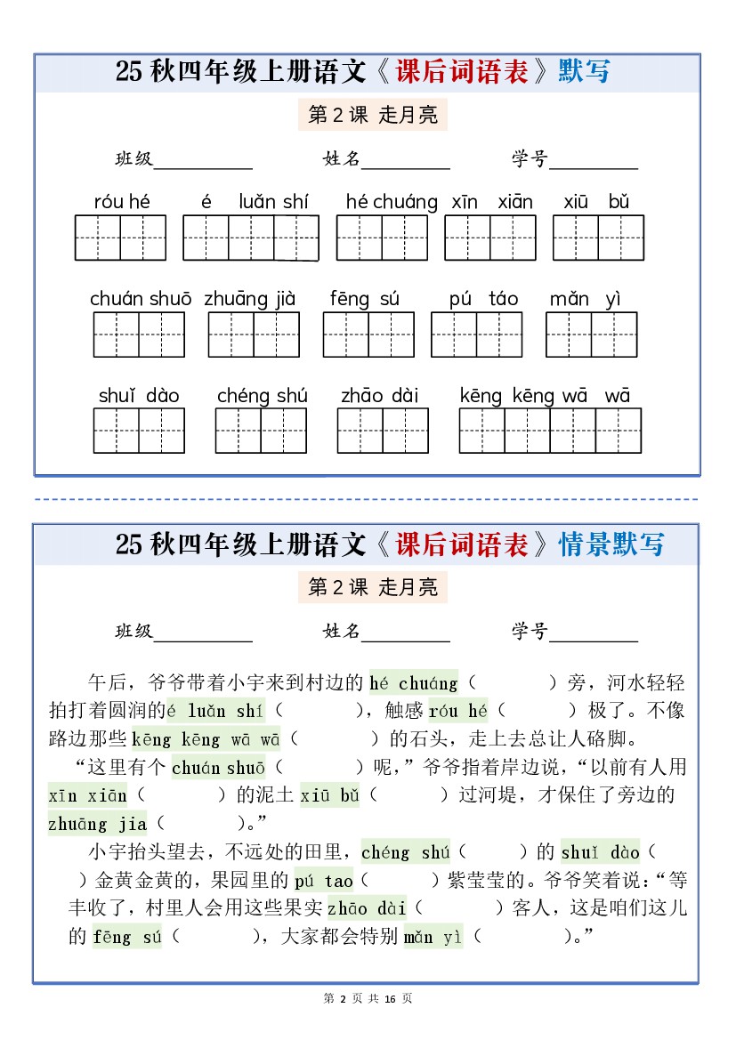 小学 【25秋四上语文课后词语表情景式默写通关小单(含答案19页)