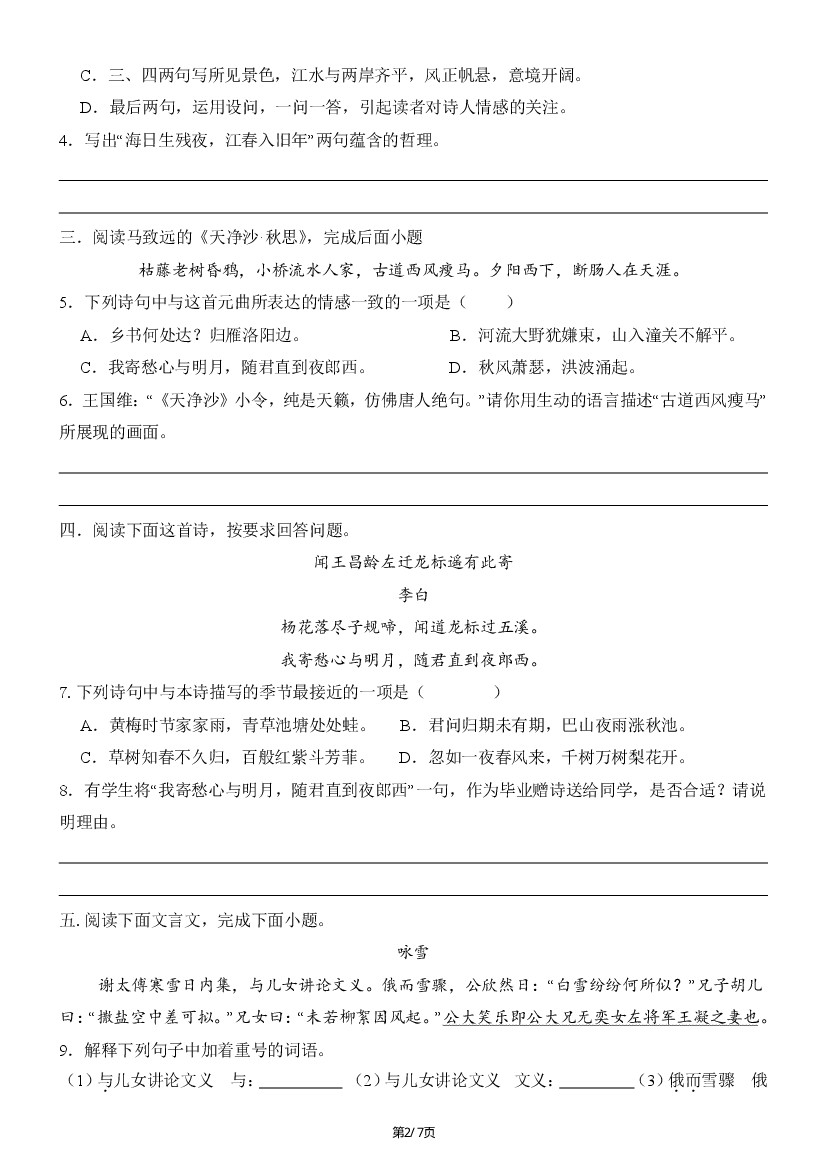 【七上语文】05古诗文阅读--2025国庆7天练(原卷版)