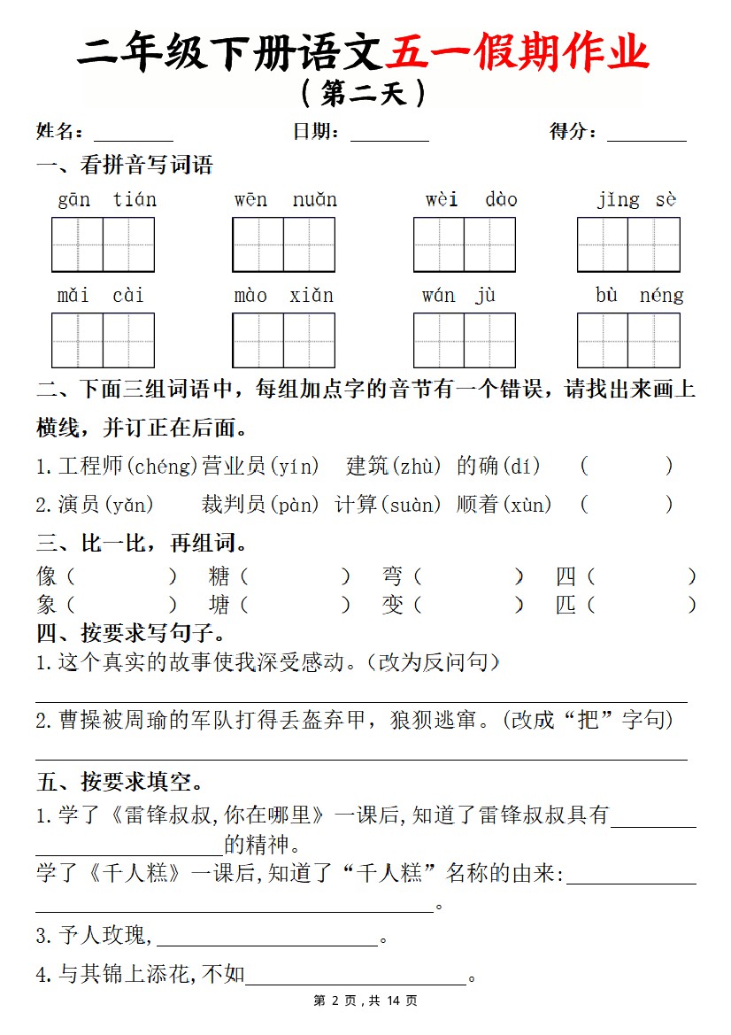 小学 二年级下册语文五一假期作业两套(含答案14页)
