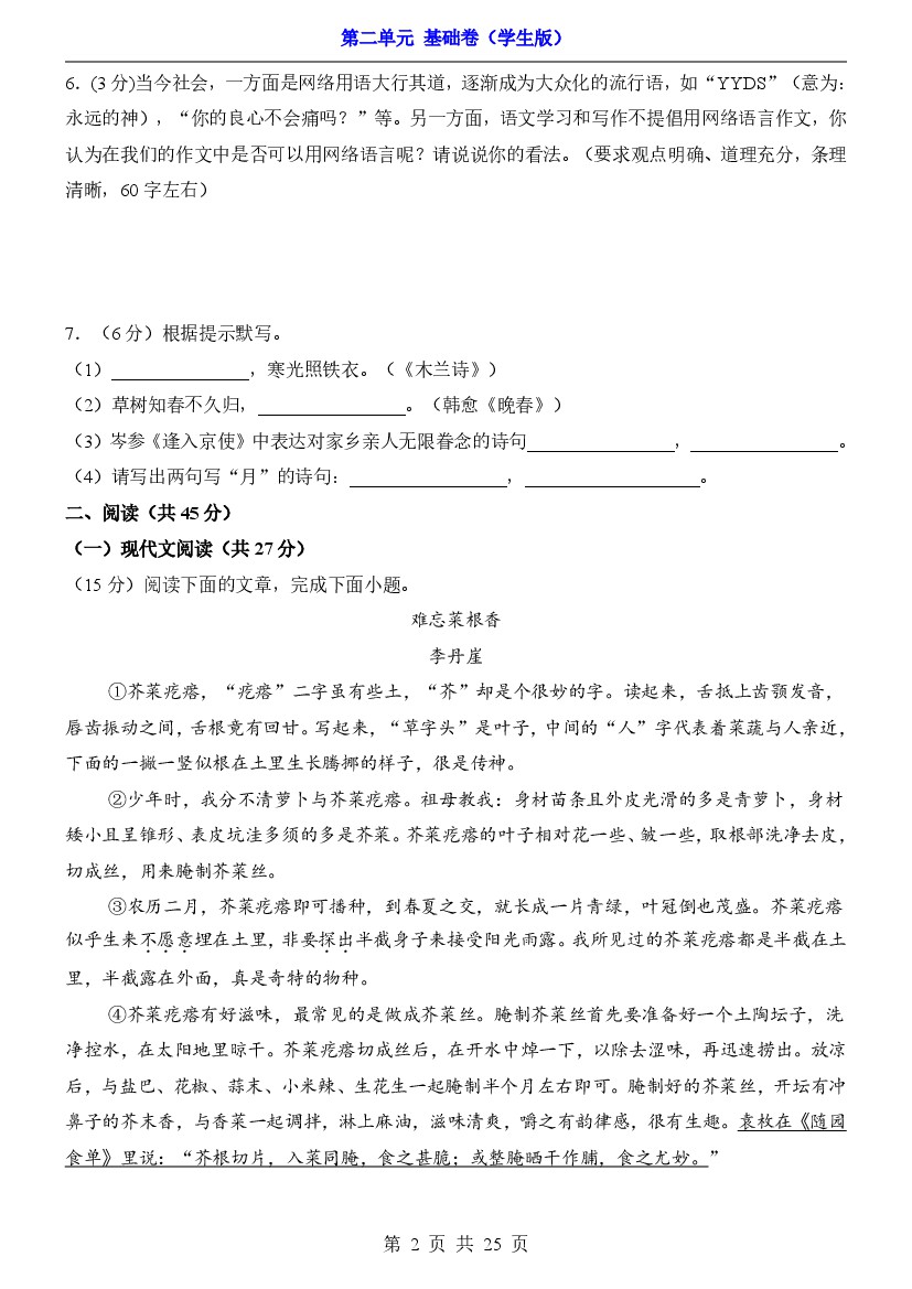 初中 25春七年级下册语文单元检测第2单元(基础卷)